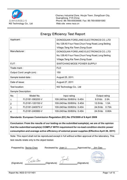 Standard:ERP Certificate Zahl:NSS-G1101401 Heft Datum:2011-08-25 Verfallsdatum:2015-08-25 Scope / Range:power supply Ausgestellt von:NS Tecnology |
