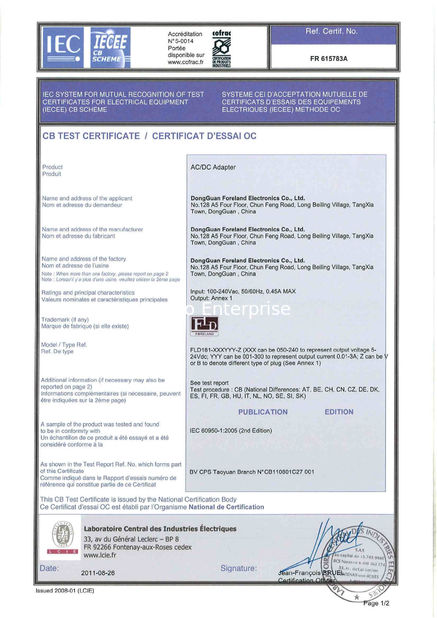Standard:CB report Zahl:FR 615783A Heft Datum:2011-08-30 Verfallsdatum:2016-08-30 Scope / Range:power supply Ausgestellt von:IEC |